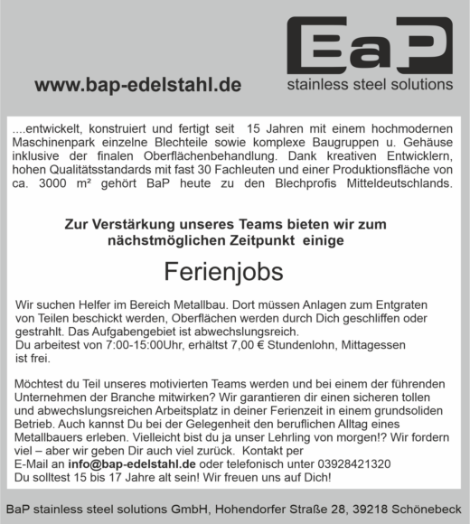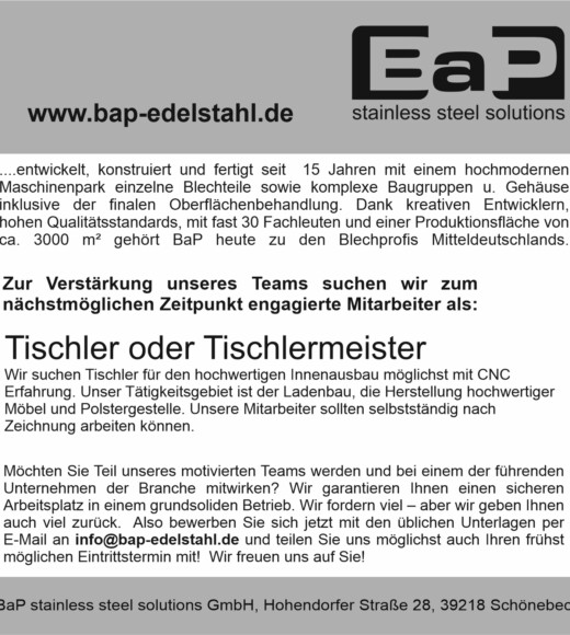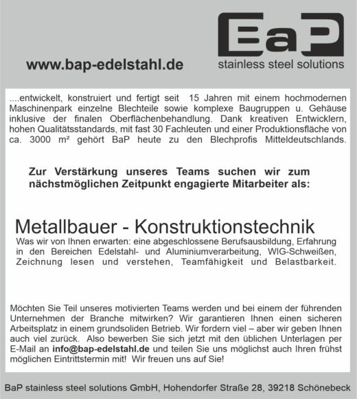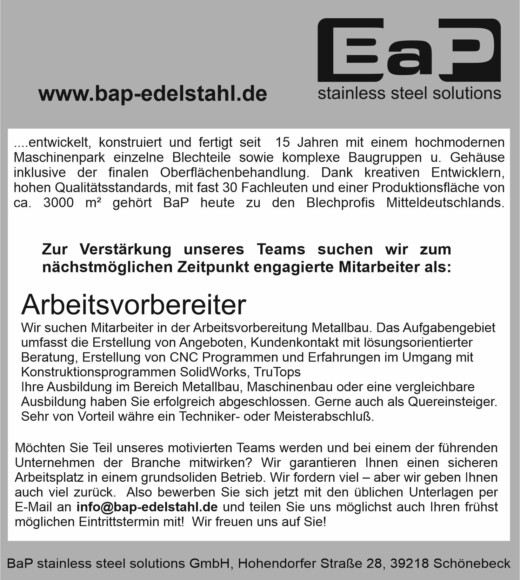 Also bewerben Sie sich jetzt mit den üblichen Unterlagen per E-Mail an info@bap-edelstahl.de und teilen Sie uns möglichst auch Ihren frühst möglichen Eintrittstermin mit!